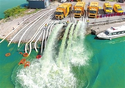 在浙江省臺(tái)州市防汛防臺(tái)綜合應(yīng)急演練中,市政強(qiáng)排車進(jìn)行作業(yè)。孫金標(biāo)攝(人民圖片)