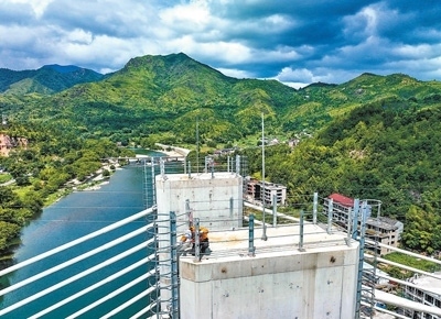7月24日,中國鐵路上海局集團有限公司寧波工務段防洪檢查小組的鐵路工人對杭溫高鐵楠溪江大橋主塔進行巡檢。新華社記者 江 漢攝