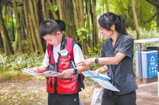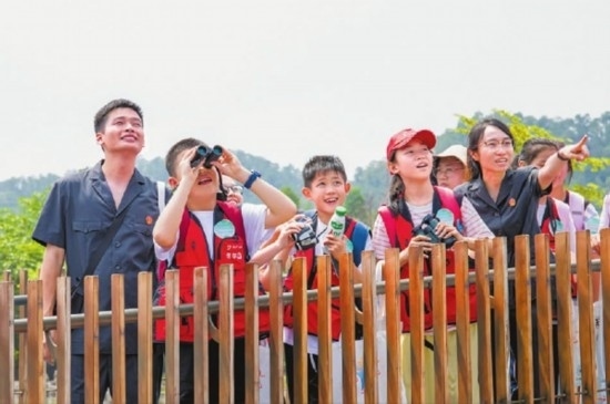 圖①:干警指引學(xué)生們觀察稀有鳥(niǎo)類。