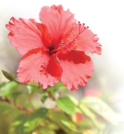 朱槿花大色艷,花蕊細(xì)長伸出于花瓣之外,花柱五裂,柱頭如粉球,花形俏麗喜慶,在我國兩廣地區(qū)被稱為“大紅花”,深受人們喜愛。在南寧,常見的朱槿花有十幾個品種,既有獨(dú)株高兩三米的小喬木、適合密植為樹籬的灌木,也有適合庭院、窗臺精巧布置的盆栽。