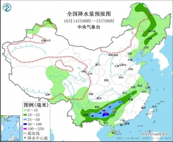 10月14日8時至15日8時,東北地區(qū)西部、云南東部、貴州南部、廣西中北部、湖南中部和西部、江西西北部等地部分地區(qū)有中到大雨,其中,云南東部、貴州南部、廣西北部、湖南西南部等地部分地區(qū)有暴雨或大暴雨(100~120毫米)。內(nèi)蒙古東北部、黑龍江西北部、新疆北部高海拔山區(qū)有中到大雪,局地暴雪。內(nèi)蒙古中部和北部、東北地區(qū)等地部分地區(qū)有5~6級風,陣風7~8級。