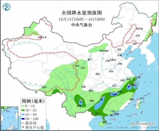 10月15日8時至16日8時,云南東北部、貴州東南部、廣西大部、湖南中部、江西中部、浙江大部等地部分地區(qū)有中到大雨,其中,湖南西部、江西中部、浙江西部等地局部地區(qū)有暴雨(50~70毫米)。青海南部、西藏東部、四川西部等地有小到中雪或雨夾雪。