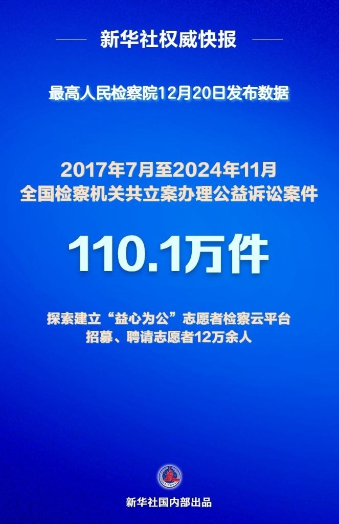 最高人民檢察院12月20日發(fā)布檢察公益訴訟有關情況顯示,2017年7月至2024年11月,全國檢察機關共立案辦理公益訴訟案件110.1萬件,其中行政公益訴訟案件98.9萬件,民事公益訴訟案件11.2萬件。