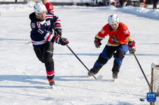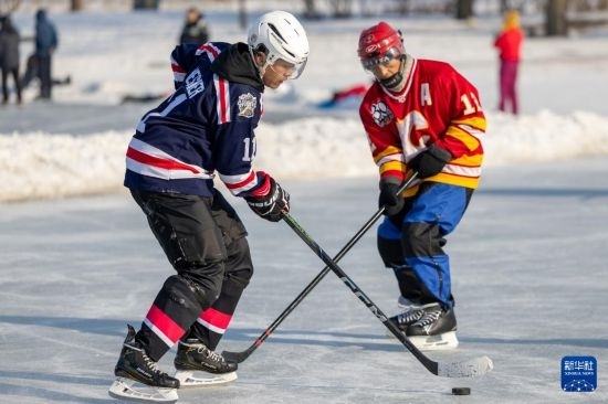 1月18日,人們在哈爾濱市丁香公園內(nèi)打冰球。