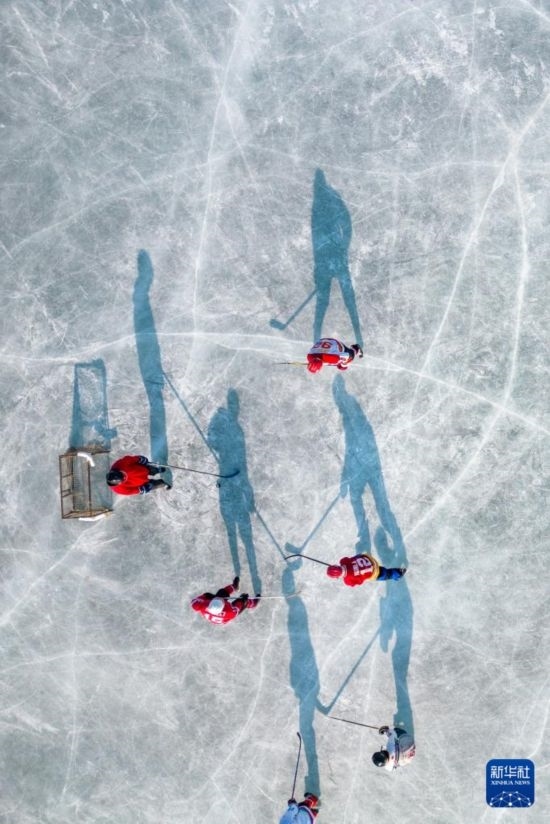 1月18日,人們在哈爾濱市丁香公園內(nèi)打冰球(無人機照片)。