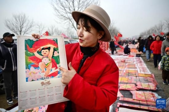 1月18日,一名攤主在泊里大集上推銷傳統(tǒng)年畫(huà)。