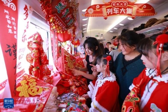 1月17日,在4187次列車的“列車大集”上,旅客在挑選春聯(lián)和“?!弊帧?/p>