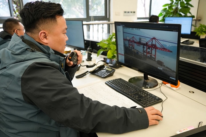 大年初一,重慶果園港集裝箱碼頭依舊繁忙。多艘集裝箱船舶停靠在碼頭,橋吊起起落落,卡車在堆場(chǎng)來回穿梭。在生產(chǎn)調(diào)度指揮中心,調(diào)度員耿杰和同事們正全神貫注地盯著屏幕,有序地調(diào)度指揮著碼頭的運(yùn)轉(zhuǎn)。