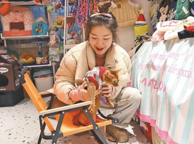 “過年了,想給貓?zhí)籼字袊L(fēng)新衣。”熟客陳女士牽著自家的阿比西尼亞貓和暹羅貓,徑直朝貓咪服飾區(qū)走去。