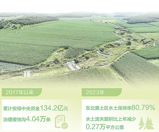 治理取得明顯成效?!笆奈濉币詠?,累計(jì)治理侵蝕溝3.3萬條,保護(hù)和恢復(fù)耕地792萬畝,每年可增加糧食綜合生產(chǎn)能力1.9億斤。據(jù)統(tǒng)計(jì),2023年增發(fā)國債用于支持侵蝕溝治理項(xiàng)目,可保護(hù)耕地面積約665萬畝,年增加糧食產(chǎn)量約1.6億斤;恢復(fù)和新增耕地約8000畝,年可增加糧食產(chǎn)量約1200萬斤?!扒治g溝治理項(xiàng)目的實(shí)施,還能完善耕地徑流調(diào)控體系,增強(qiáng)溝道排水能力,降低洪澇災(zāi)害風(fēng)險(xiǎn)?!瘪T偉表示。