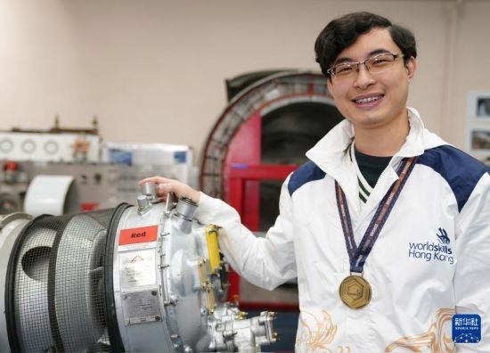 在香港專業(yè)教育學(xué)院,黃富東佩戴著“2024年里昂世界技能大賽”飛機(jī)維修項目的銅牌和渦輪螺旋槳飛機(jī)引擎合影(1月14日攝)。新華社發(fā)(王申攝)