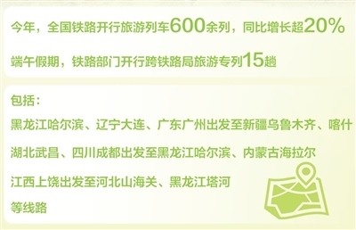 國鐵集團(tuán)數(shù)據(jù)顯示:今年全國鐵路已開行旅游列車600余列,同比增長超20%。端午假期,鐵路部門開行跨鐵路局旅游專列15趟,包括從黑龍江哈爾濱、遼寧大連、廣東廣州出發(fā)至新疆烏魯木齊、喀什,湖北武昌、四川成都出發(fā)至黑龍江哈爾濱、內(nèi)蒙古海拉爾,江西上饒出發(fā)至河北山海關(guān)、黑龍江塔河等線路。