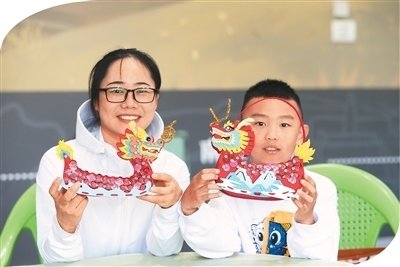 在青海省西寧市博物館舉辦的端午節(jié)主題活動(dòng)中,家長(zhǎng)和小朋友展示制作的龍舟擺件。