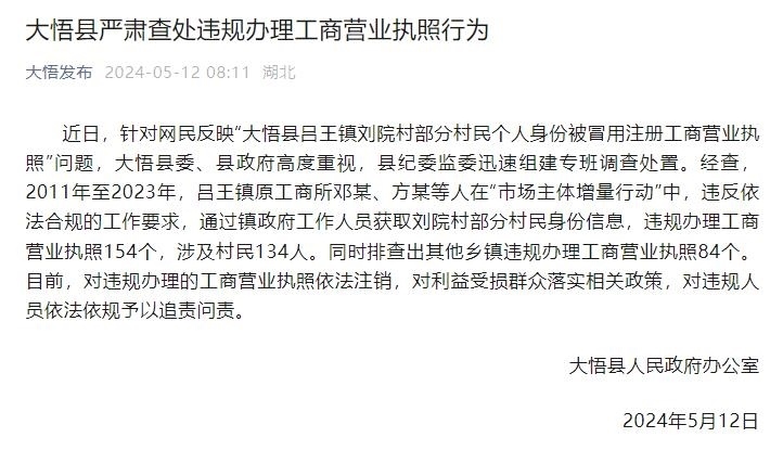 上百村民身份被冒用注冊營業(yè)執(zhí)照,官方通報:追責(zé)問責(zé) 目前,對違規(guī)辦理的工商營業(yè)執(zhí)照依法注銷,對利益受損......