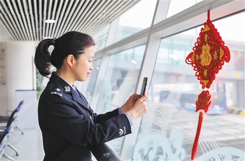 2月6日,青島機(jī)場(chǎng)出入境邊防檢查站女子旅檢科民警馮哲利用工作間隙與遠(yuǎn)在老家的兒子視頻通話。解豪攝(新華社發(fā))