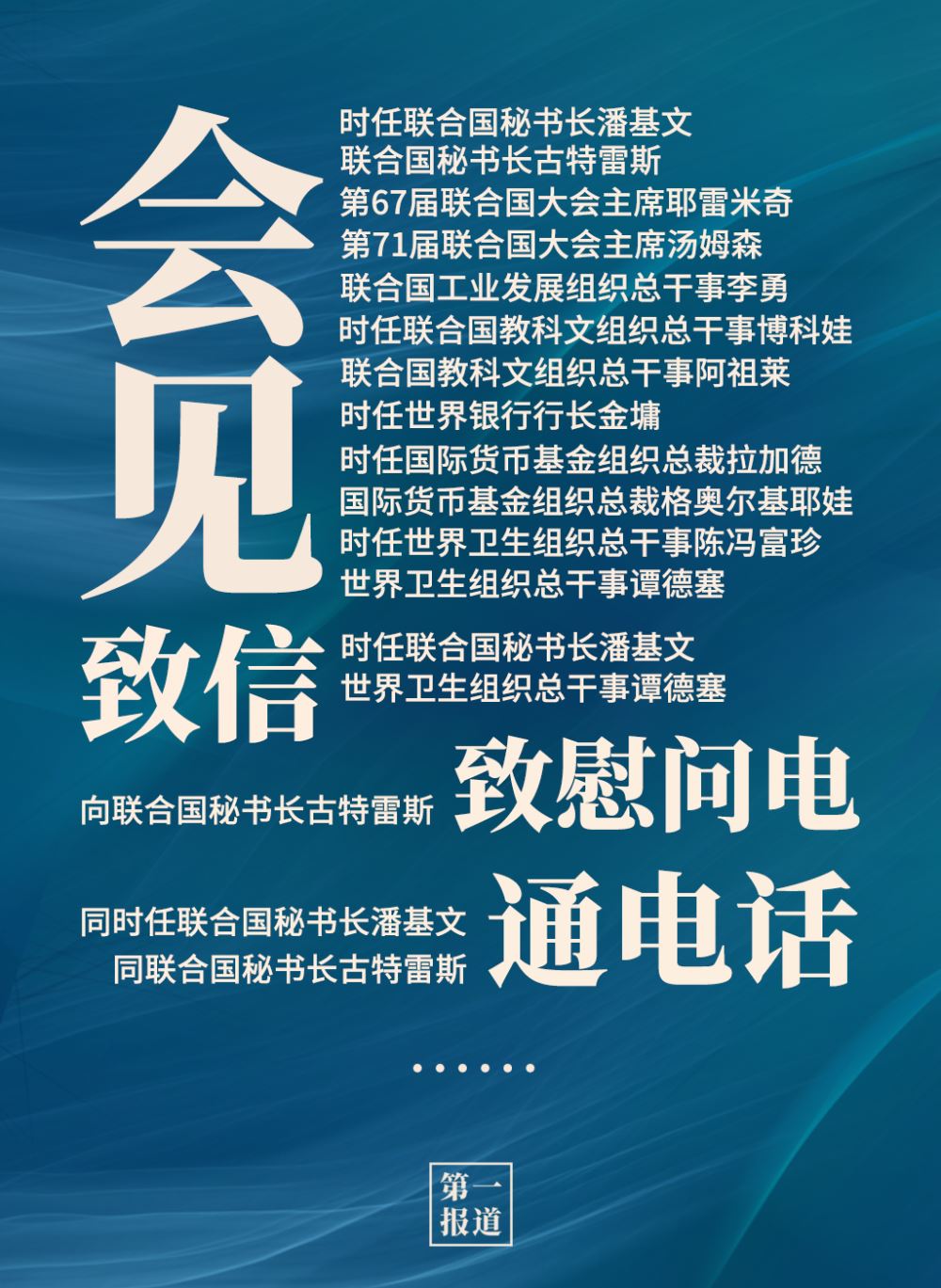 2013年以來,習(xí)主席通過會(huì)見、通話、致信函等多種方式同聯(lián)合國主要官員保持密切溝通?;?dòng)對(duì)象包括聯(lián)合國秘書長、聯(lián)合國大會(huì)主席,還有聯(lián)合國工業(yè)發(fā)展組織、聯(lián)合國教科文組織、世界銀行、國際貨幣基金組織、世界衛(wèi)生組織等聯(lián)合國專門機(jī)構(gòu)主要負(fù)責(zé)人。