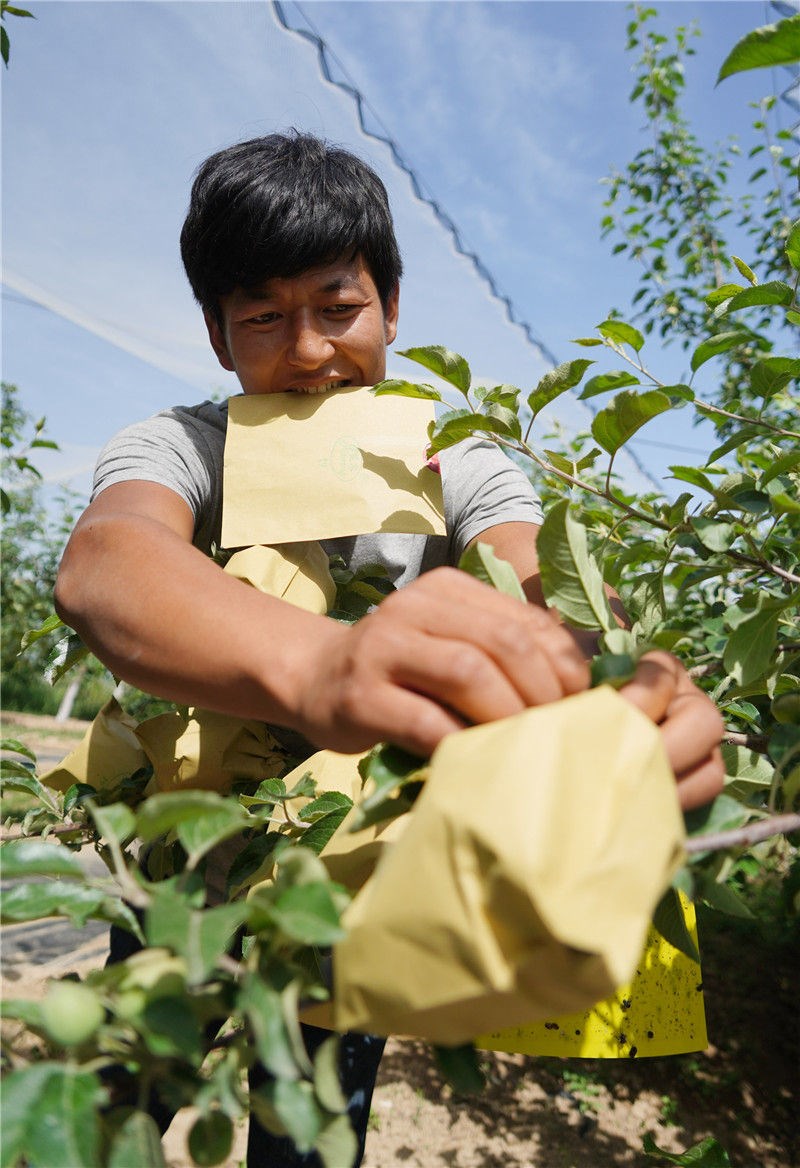陜西省延安市梁家河村村民在給蘋果套袋(2018年5月24日攝)。新華社記者邵瑞攝