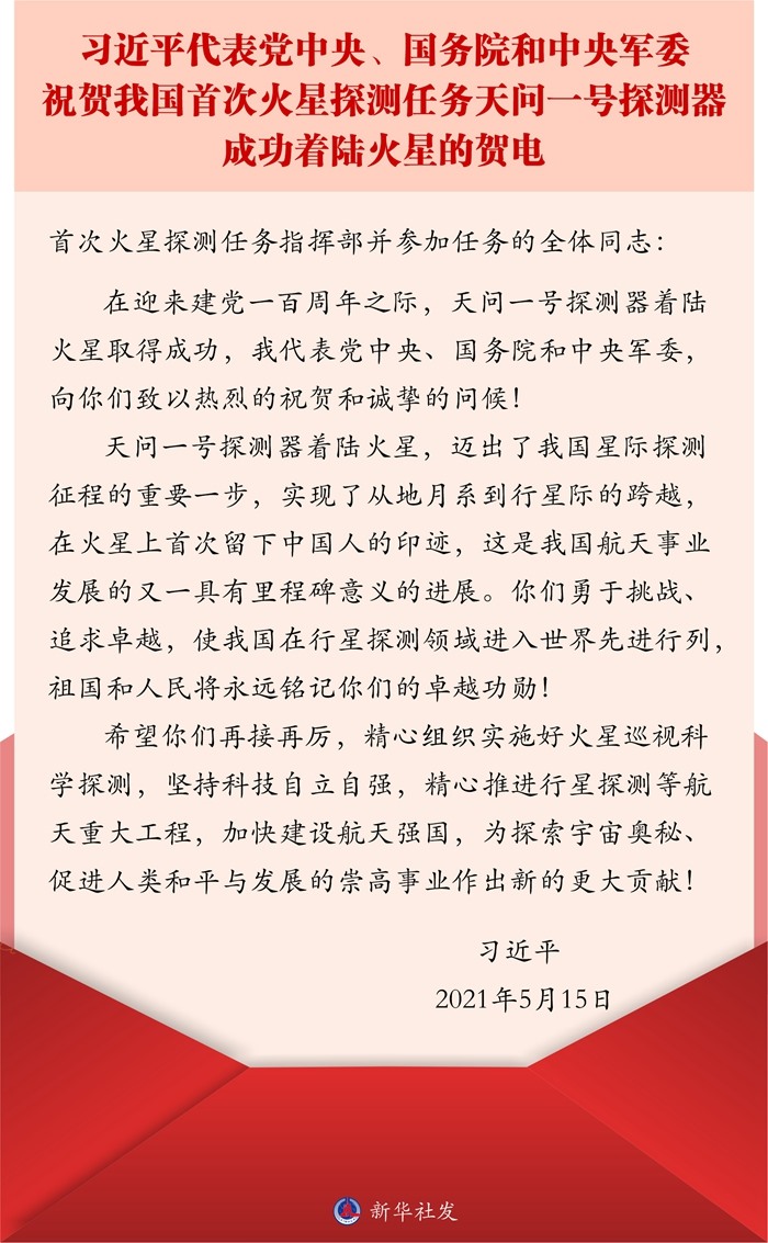 在迎來建黨一百周年之際,天問一號(hào)探測(cè)器著陸火星取得成功,我代表黨中央、國(guó)務(wù)院和中央軍委,向你們致以熱烈的祝賀和誠(chéng)摯的問候!