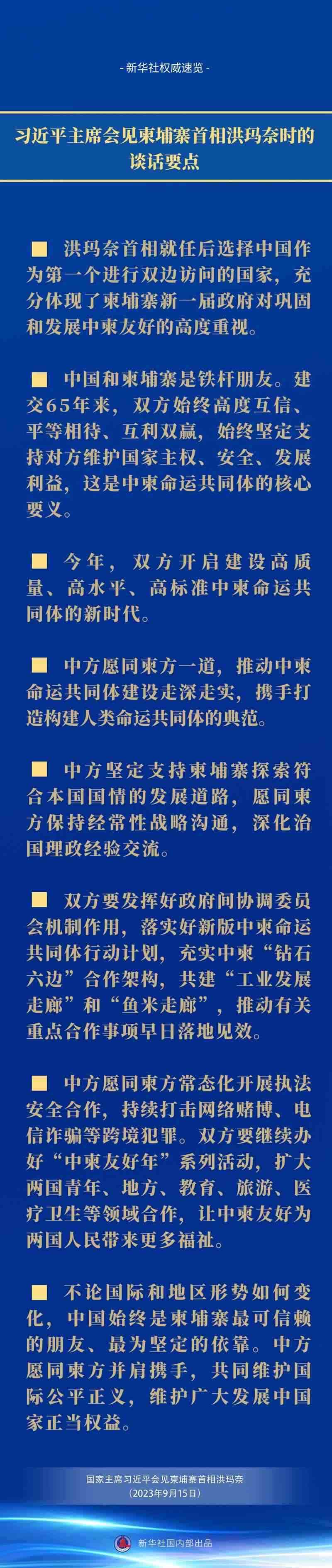 新華社權(quán)威速覽|習(xí)近平主席會(huì)見柬埔寨首相洪瑪奈時(shí)的談話要點(diǎn) 9月15日上午,國家主席習(xí)近平在人民大會(huì)堂會(huì)見來華進(jìn)行......