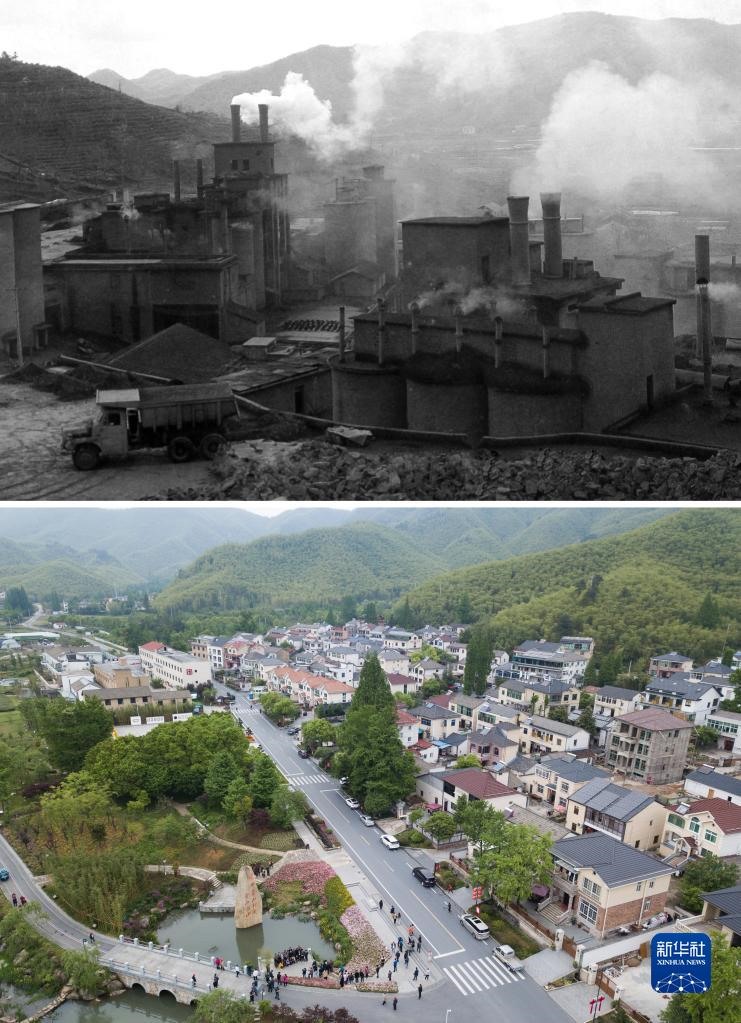 這是一張拼版照片,上圖為:浙江省湖州市安吉縣天荒坪鎮(zhèn)余村二十世紀(jì)八十年代的資料照片;下圖為:2018年4月24日,游客在整修一新的余村游覽(新華社記者翁忻旸攝)。新華社發(fā)