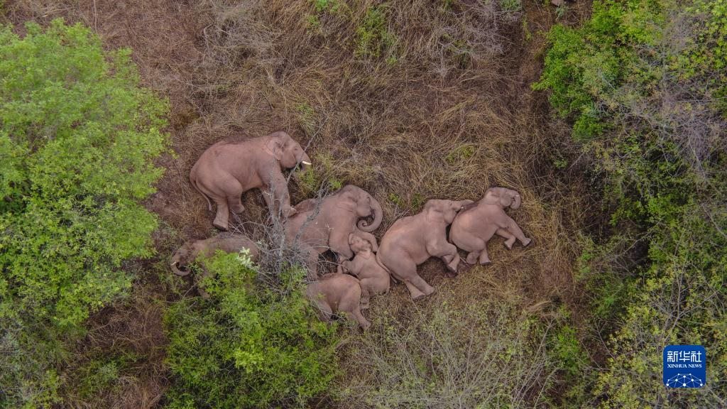 6月7日在云南省昆明市晉寧區(qū)夕陽彝族鄉(xiāng)拍攝的野象(無人機(jī)照片)。新華社發(fā)