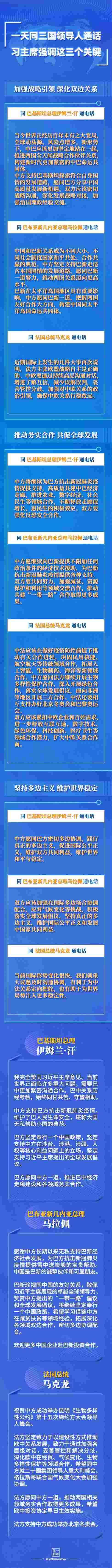 中國和巴基斯坦是“全天候戰(zhàn)略合作伙伴關(guān)系”;中國和巴新是“不同大小、不同社會制度國家和平共處、合作共贏的典范”;中國和法國同為聯(lián)合國安理會常任理事國……3次通話內(nèi)容豐富,“第一報道”為您梳理——