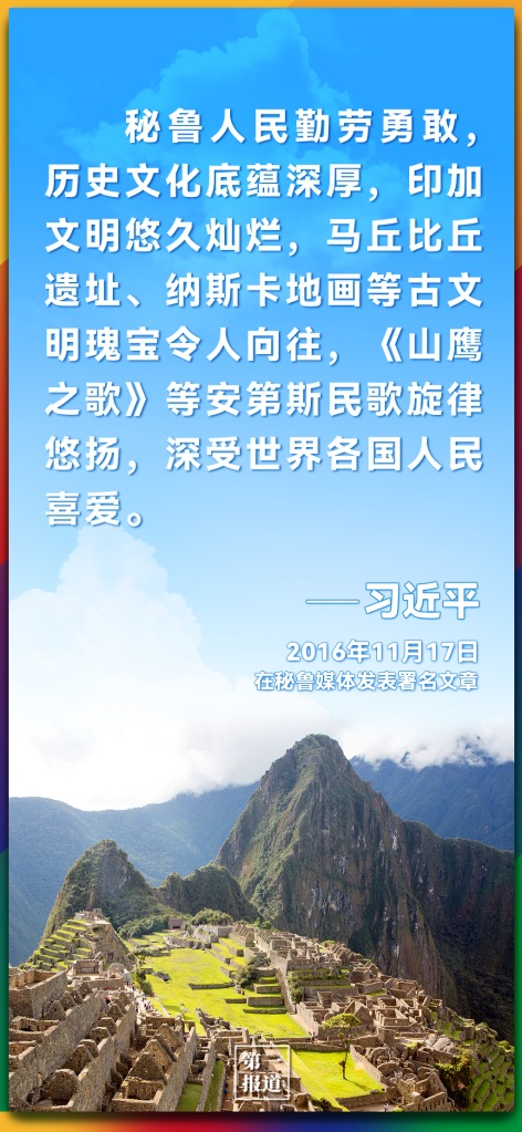 2016年對(duì)秘魯進(jìn)行國事訪問期間,習(xí)近平主席在時(shí)任秘魯總統(tǒng)庫琴斯基的陪同下,出席了中拉文化交流年閉幕式。途中參觀《文明的長(zhǎng)河——中拉文明互鑒》圖片展時(shí),共同欣賞了中秘兩國樂隊(duì)一起演奏的中國民歌《沂蒙山歌》和秘魯民歌《山鷹之歌》。