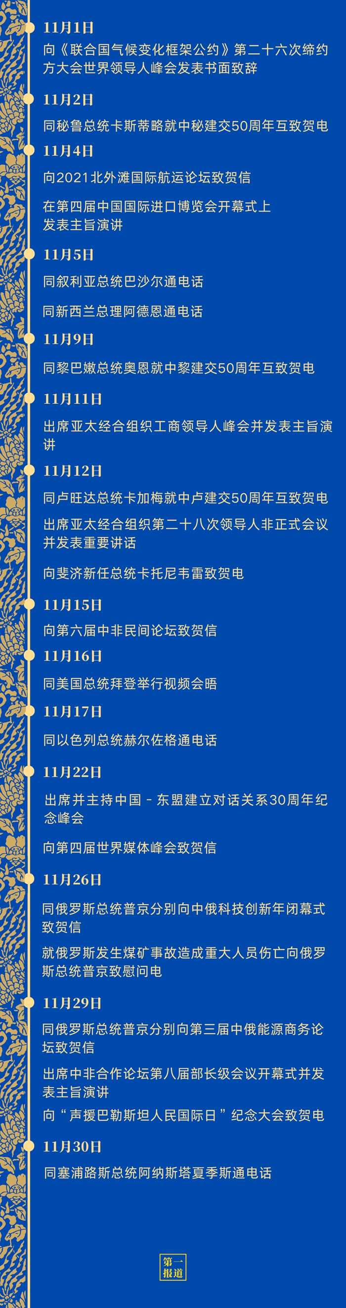 11月,中國元首外交活動(dòng)豐富、頻密,在雙邊關(guān)系、多邊合作、全球發(fā)展、共建家園四方面彰顯強(qiáng)大推動(dòng)力——