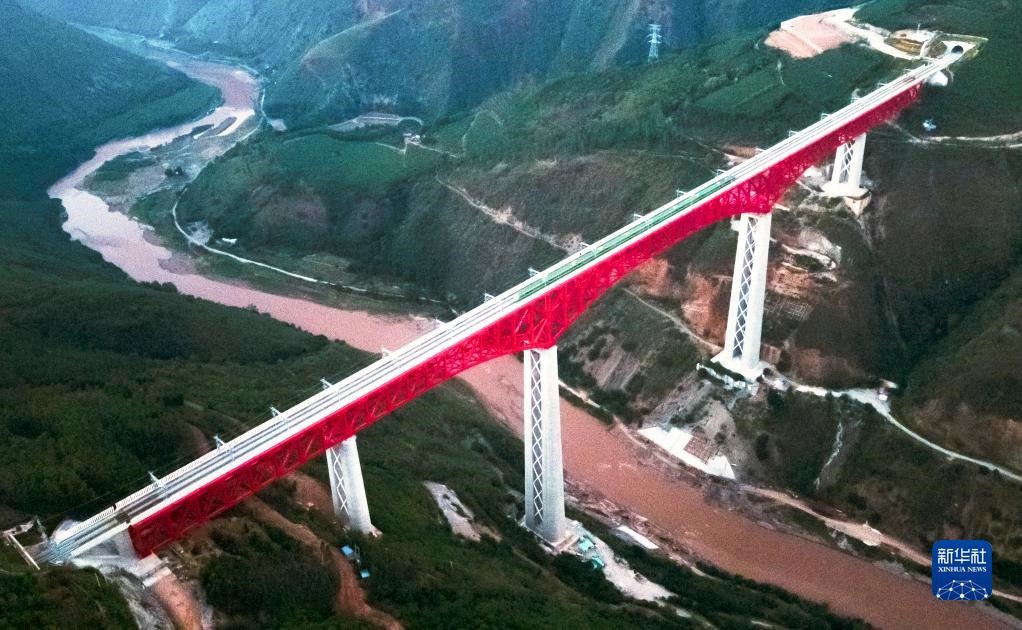 中老鐵路首發(fā)列車(chē)駛過(guò)中國(guó)云南省元江哈尼族彝族傣族自治縣境內(nèi)的元江雙線(xiàn)特大橋(12月3日攝,無(wú)人機(jī)照片)。新華社記者王冠森攝