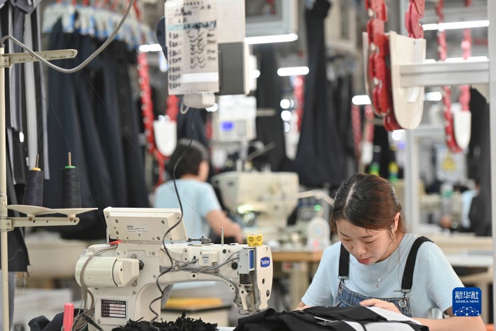 在位于福建省泉州市經(jīng)濟(jì)技術(shù)開(kāi)發(fā)區(qū)的九牧王西褲智能化生產(chǎn)車(chē)間,工人在自動(dòng)化西褲吊掛流水線(xiàn)上作業(yè)(7月30日攝)。新華社記者宋為偉攝