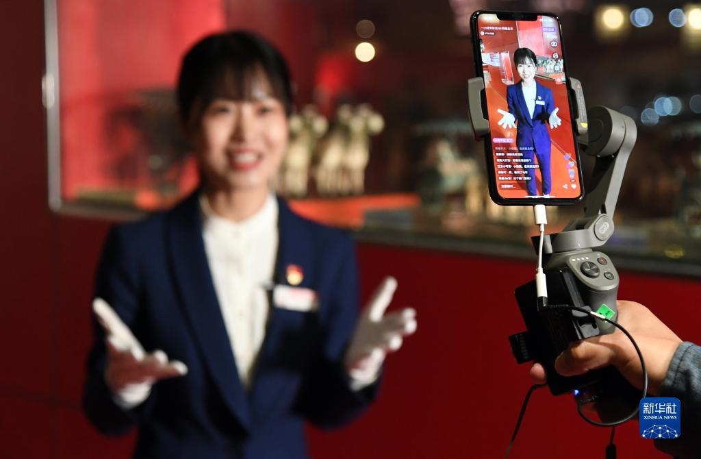 2020年4月30日,在北京汽車博物館,講解員曾紅娟通過網(wǎng)絡(luò)直播平臺(tái)為觀眾介紹館內(nèi)的藏品車。新華社記者 任超/攝