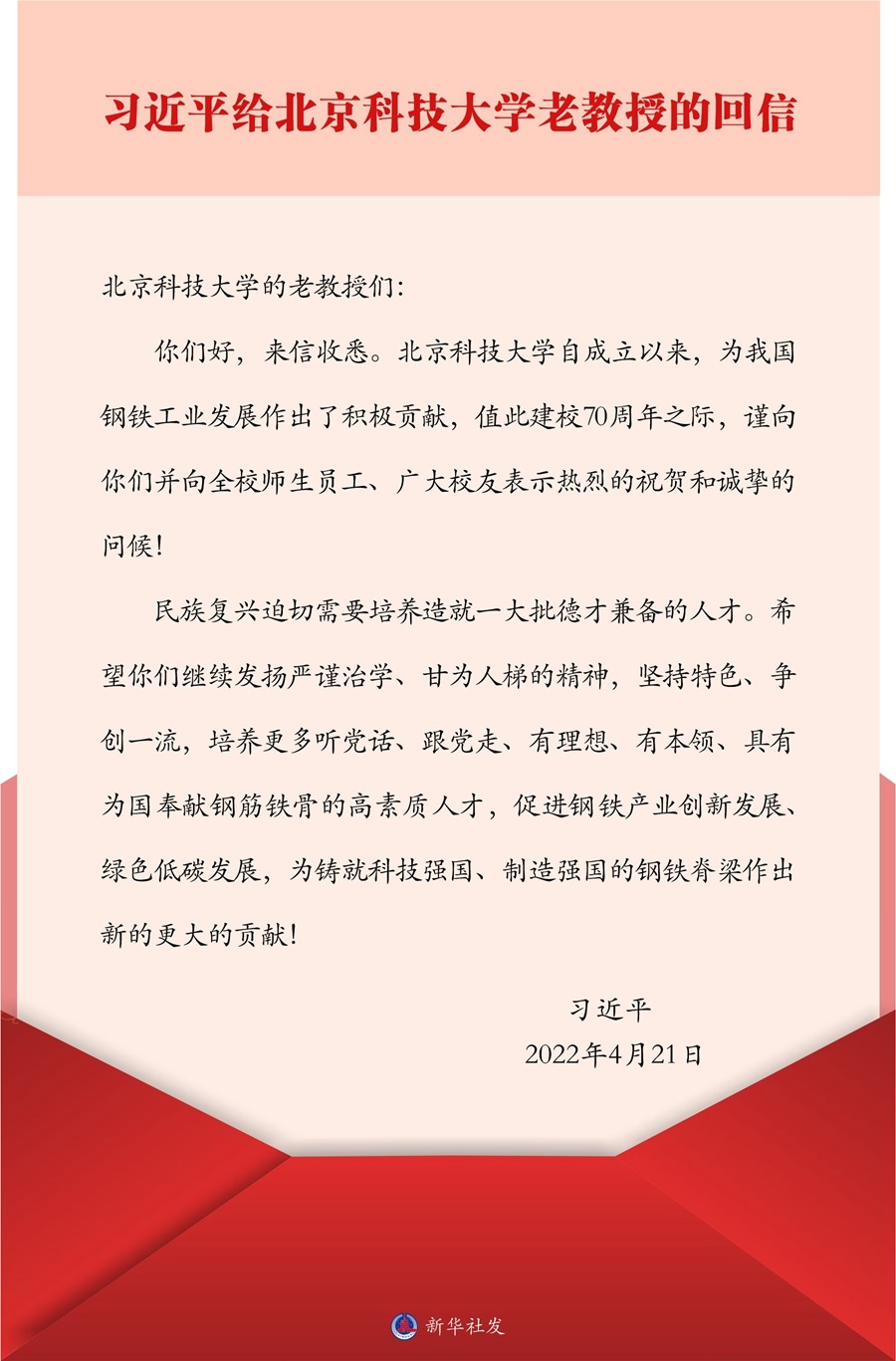 新華社北京4月22日電 中共中央總書記、國(guó)家主席、中央軍委主席習(xí)近平4月21日給北京科技大學(xué)的老教授回信,對(duì)培養(yǎng)更多高素質(zhì)人才,促進(jìn)鋼鐵產(chǎn)業(yè)創(chuàng)新發(fā)展、綠色低碳發(fā)展提出殷切期望。