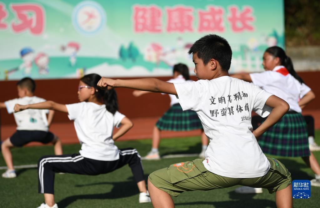 在陜西省安康市平利縣老縣鎮(zhèn)中心小學(xué)的操場上,學(xué)生們在課后參加武術(shù)社團(tuán)活動(dòng)(2020年9月7日攝)。新華社記者 李一博 攝