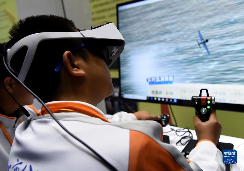 北京市八一學(xué)校的學(xué)生在北京市中小學(xué)生特色科技活動(dòng)展示上體驗(yàn)VR技術(shù)(2018年11月24日攝)。新華社記者 羅曉光 攝