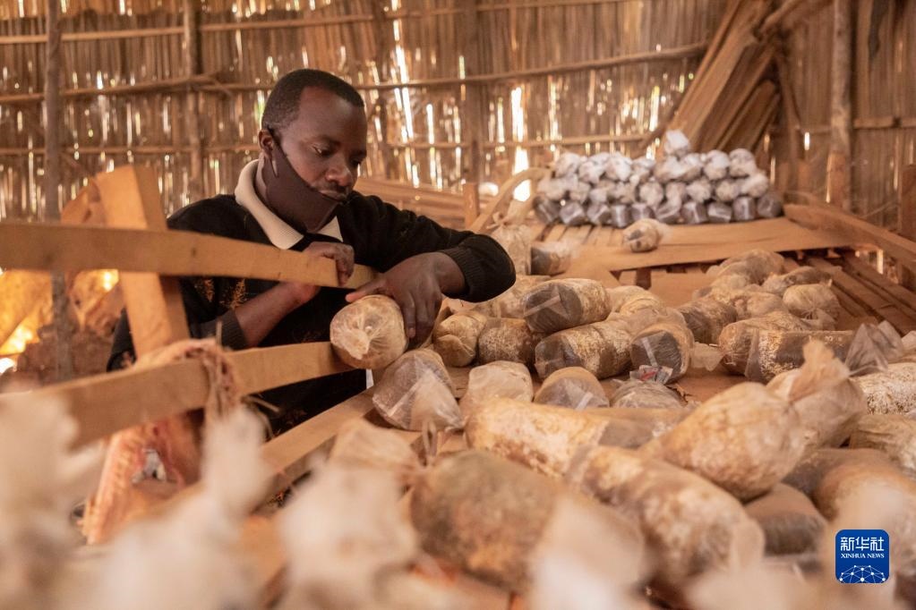在盧旺達(dá)首都基加利的一家食用菌培育作坊,作坊主人埃馬紐埃爾·阿希馬納檢查菌袋(2020年9月9日攝)。中國(guó)福建農(nóng)林大學(xué)的菌草專家2006年來到盧旺達(dá)開始菌草技術(shù)合作項(xiàng)目,在當(dāng)?shù)厥痉逗屯茝V菌草技術(shù)。新華社發(fā)(西里爾·恩德格亞攝)