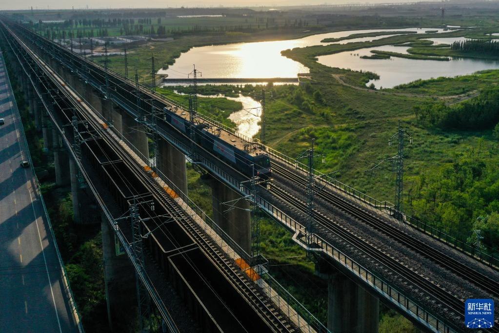 重載列車行駛在大秦鐵路上(2022年7月16日攝,無人機照片)。為做好迎峰度夏能源保供工作,中國鐵路太原局集團有限公司在確保運輸安全的前提下全力提升煤炭運量。新華社記者曹陽攝