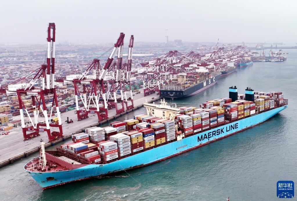 在山東港口青島港前灣碼頭,歐洲貿易航線的“美途馬士基”集裝箱貨輪解纜起航(2022年7月29日攝,無人機照片)。新華社記者李紫恒攝