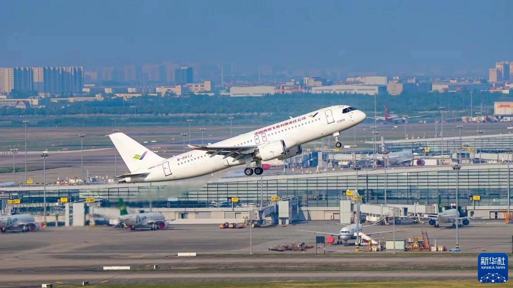 2022年5月14日6時52分,編號為B-001J的C919大飛機從上海浦東機場第4跑道起飛,于9時54分安全降落,標志著中國商飛公司即將交付首家用戶的首架C919大飛機首次飛行試驗圓滿完成。新華社發(fā)