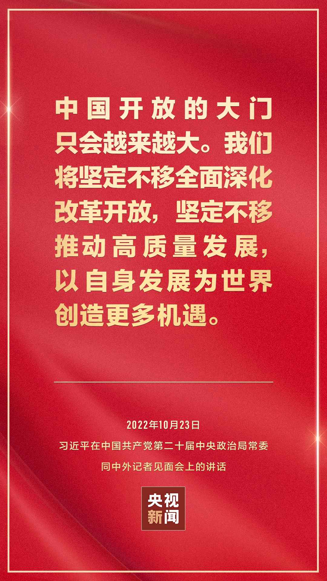 在中國共產黨第二十屆中央委員會第一次全體會議上當選的中共中央總書記習近平和中共中央政治局常委李強、趙樂際、王滬寧、蔡奇、丁薛祥、李希,23日中午在人民大會堂同采訪中共二十大的中外記者見面。習近平發(fā)表重要講話。