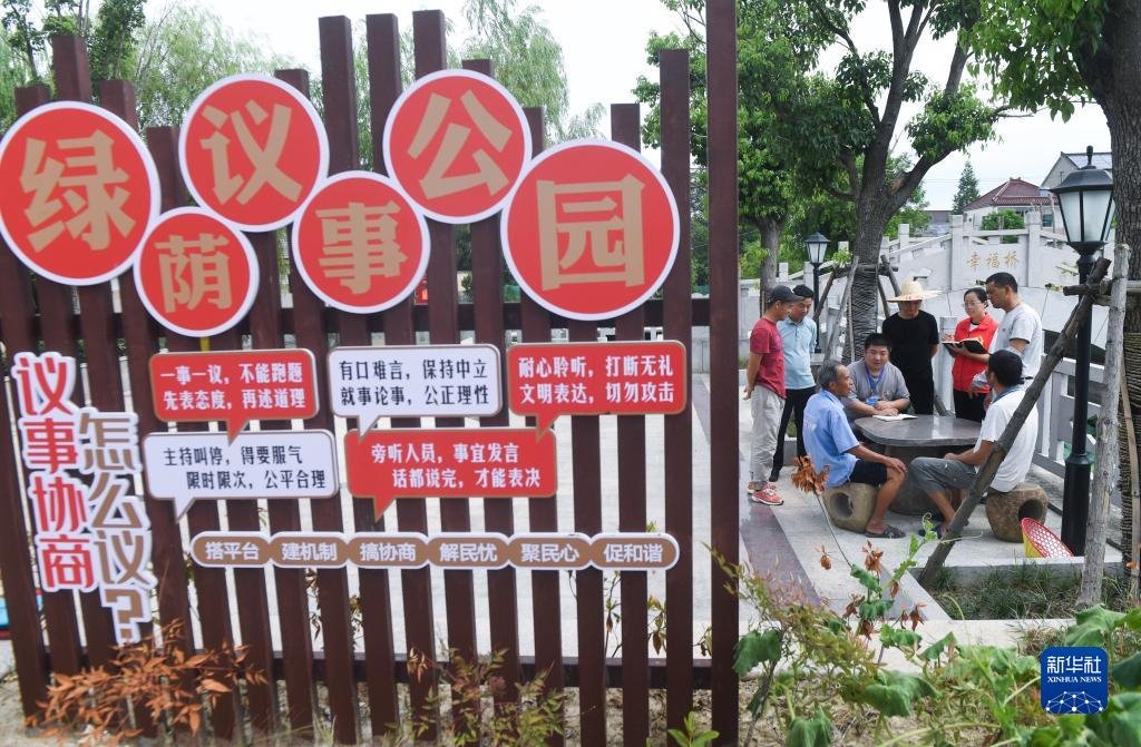 在浙江省湖州市長興縣呂山鄉(xiāng)龍溪村的議事公園內,田園議事會成員開展討論協(xié)商(2022年7月21日攝)。新華社記者 徐昱 攝