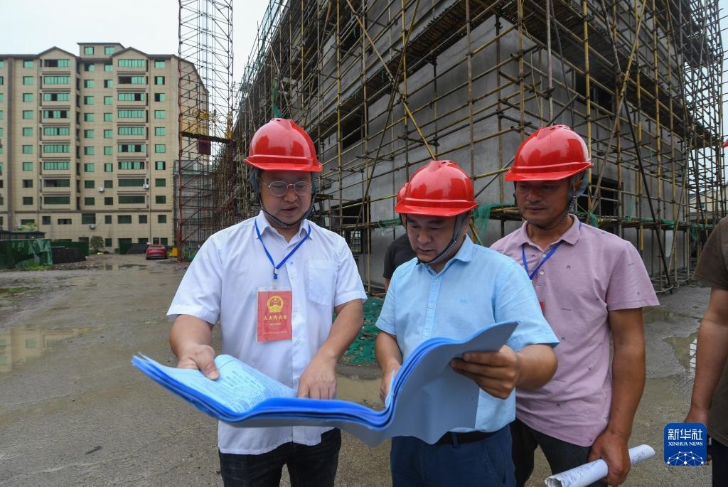 在浙江省湖州市吳興區(qū)東林鎮(zhèn)星火村,當?shù)厝舜蟠砑按迕翊韺π腔鸫遛r民新村建設項目的施工進展情況進行監(jiān)督檢查(2021年6月2日攝)。新華社記者 徐昱 攝