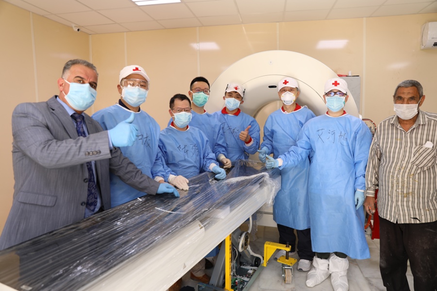 2020年4月12日,在伊拉克首都巴格達(dá),援助伊拉克防治新冠肺炎的中國(guó)醫(yī)療專家將CT設(shè)備搬運(yùn)到機(jī)房后與伊方人員合影。