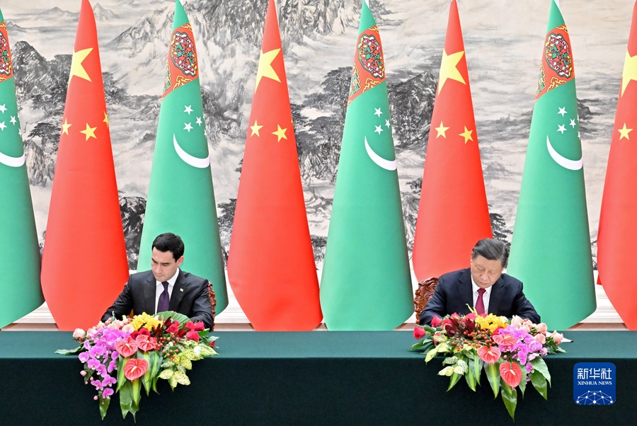 會談后,兩國元首簽署并發(fā)表《中華人民共和國和土庫曼斯坦聯(lián)合聲明》,共同見證簽署“一帶一路”、綠色發(fā)展、數(shù)字經(jīng)濟、衛(wèi)生、文化、體育、新聞媒體、天然氣等領域合作文件。
