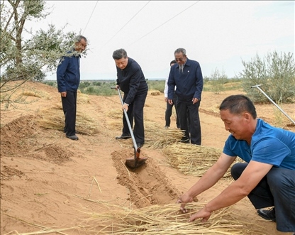 △2019年8月21日,正在甘肅考察的習(xí)近平總書記來到古浪縣八步沙林場??疾熘校闷鹨话验_溝犁,參與到治沙勞動中。
