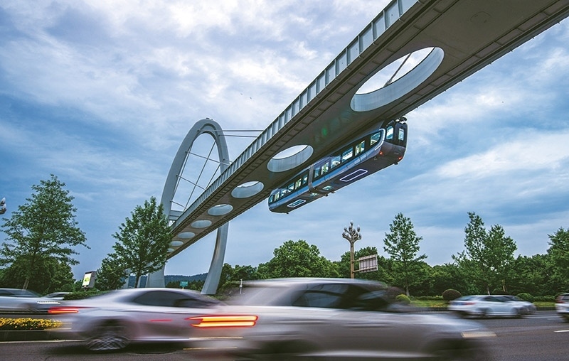 列車懸掛在軌道下方,從人們頭頂飛馳而過(guò),這樣的科幻場(chǎng)景,最近在武漢東湖新技術(shù)開(kāi)發(fā)區(qū)成了現(xiàn)實(shí)。圖為2023年5月9日,武漢“光谷光子號(hào)”空軌列車在綜合聯(lián)調(diào)和試運(yùn)行中。 新華社記者 肖藝九/攝