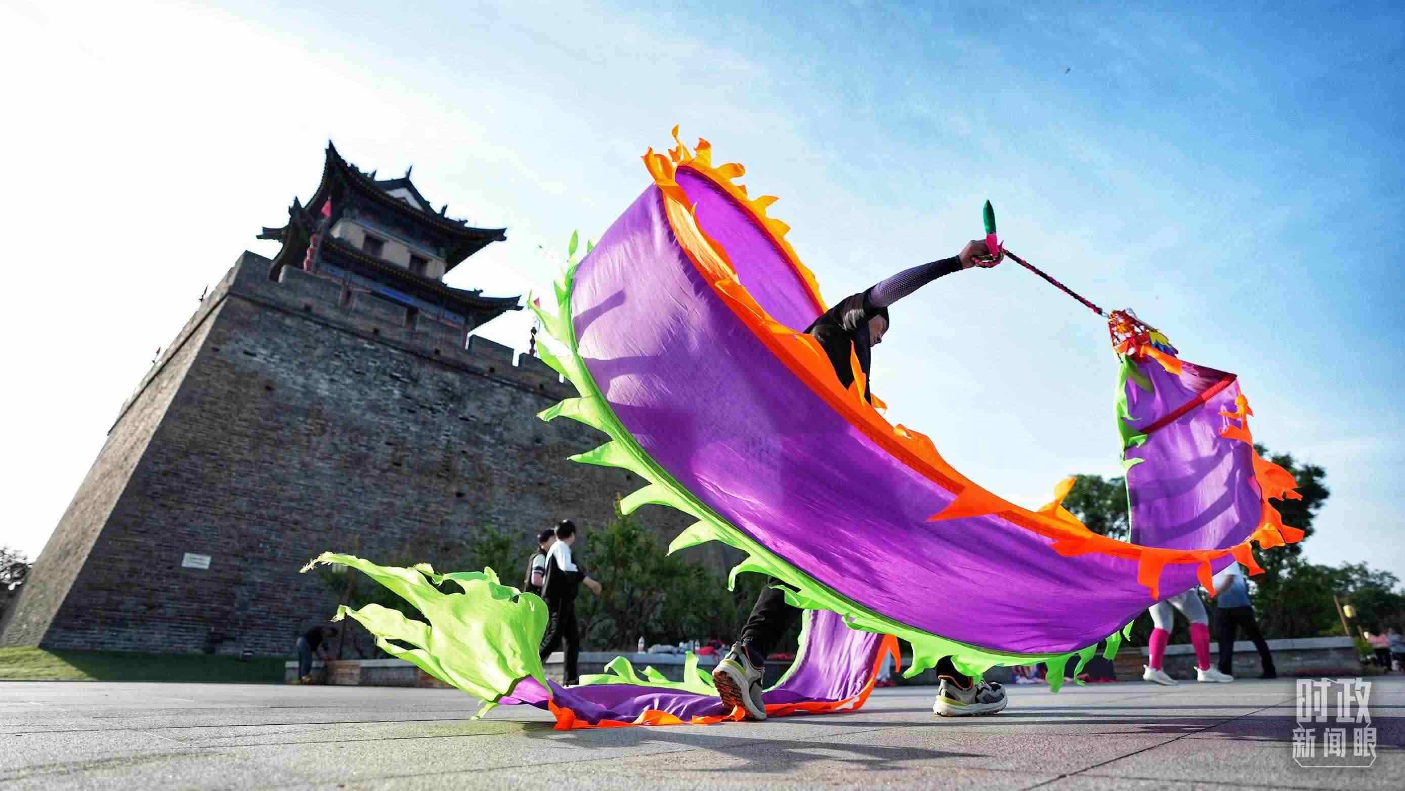△ 清晨,西安市民在古城墻角樓下舞龍健身。(總臺國廣記者李晉拍攝)