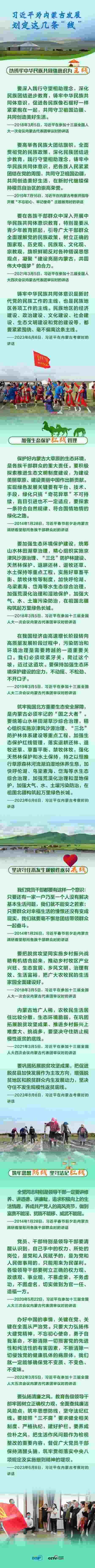 6月8日,習(xí)近平總書記聽取內(nèi)蒙古自治區(qū)黨委和政府工作匯報后發(fā)表講話,強(qiáng)調(diào)內(nèi)蒙古要“以鑄牢中華民族共同體意識為主線”,“加強(qiáng)生態(tài)保護(hù)紅線管理”,“堅決守住不發(fā)生規(guī)模性返貧底線”,“筑牢思想防線,堅守法紀(jì)紅線”。