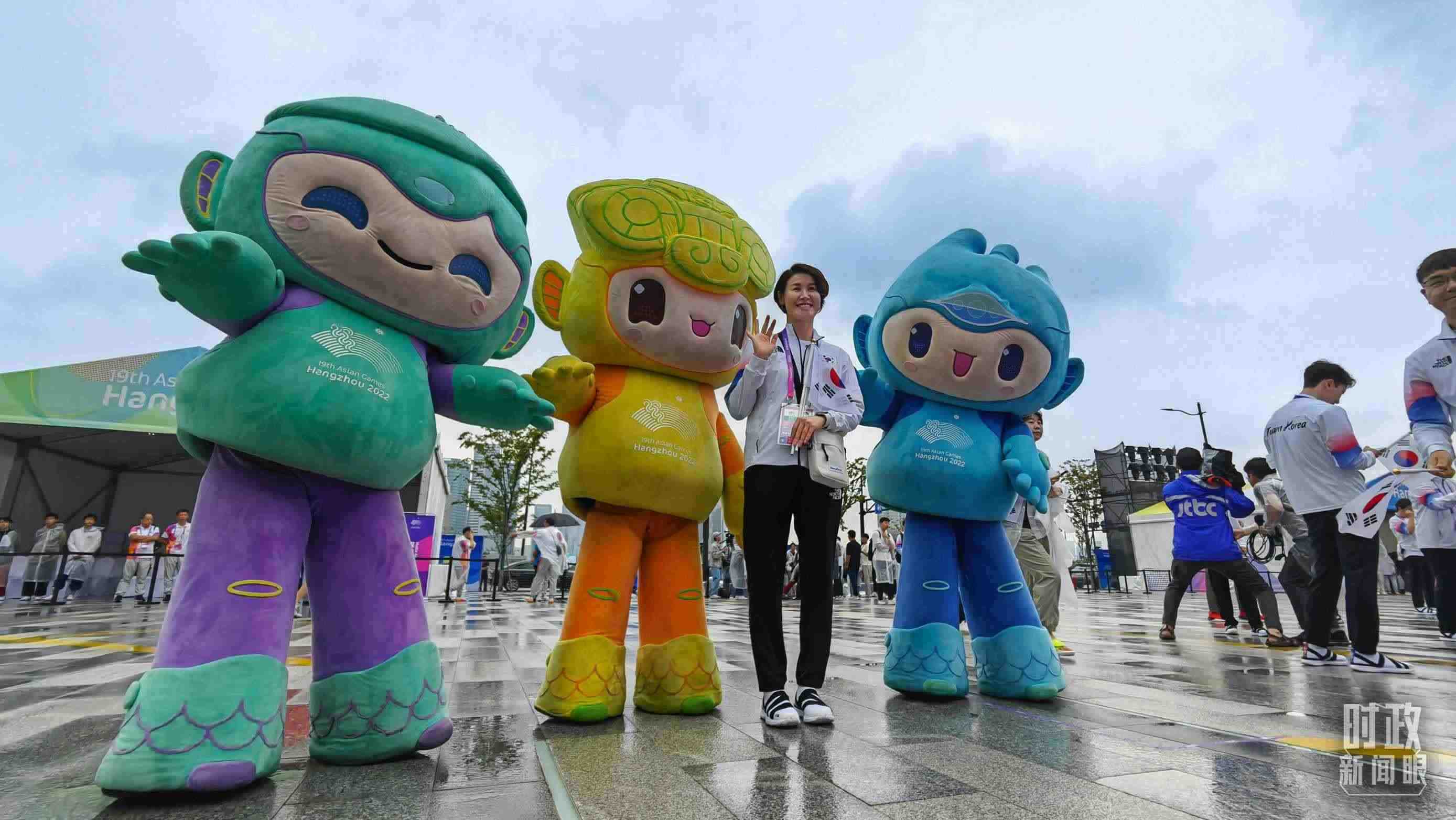 △亞運(yùn)村為各代表團(tuán)舉行歡迎儀式,隊員們紛紛與吉祥物“蓮蓮”、“琮琮”、“宸宸”合影。(總臺央視記者陳偉奎拍攝)