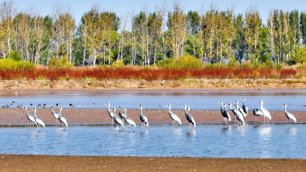 在山東黃河三角洲國家級自然保護區(qū)拍攝的白枕鶴(2022年10月18日攝)。新華社發(fā)(楊斌 攝)