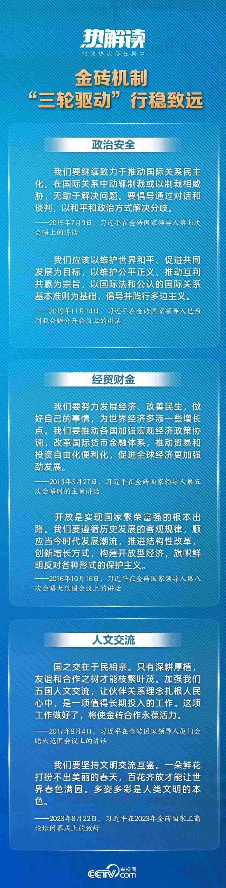 從字母組合的符號象征到一塊實打?qū)嵉摹敖鸫u”,回顧金磚合作機(jī)制走過的歷程,習(xí)近平主席倡導(dǎo)的“三輪驅(qū)動”合作架構(gòu)為金磚國家合作發(fā)展提供了可行有效的抓手。